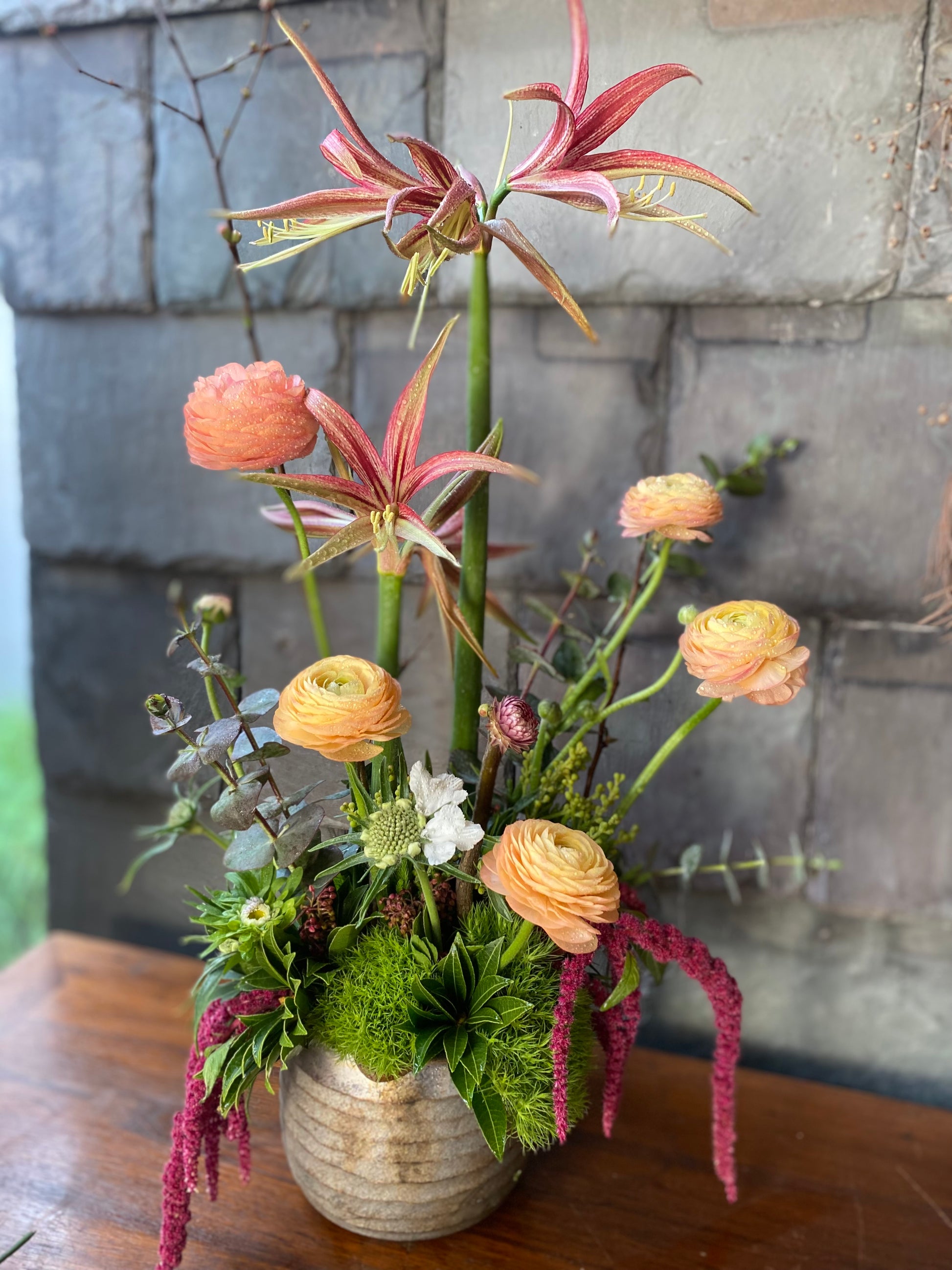 This designer's choice arrangement features a modern, linear style, with a selection of unusual, formful blooms. In a carefully chosen vessel.