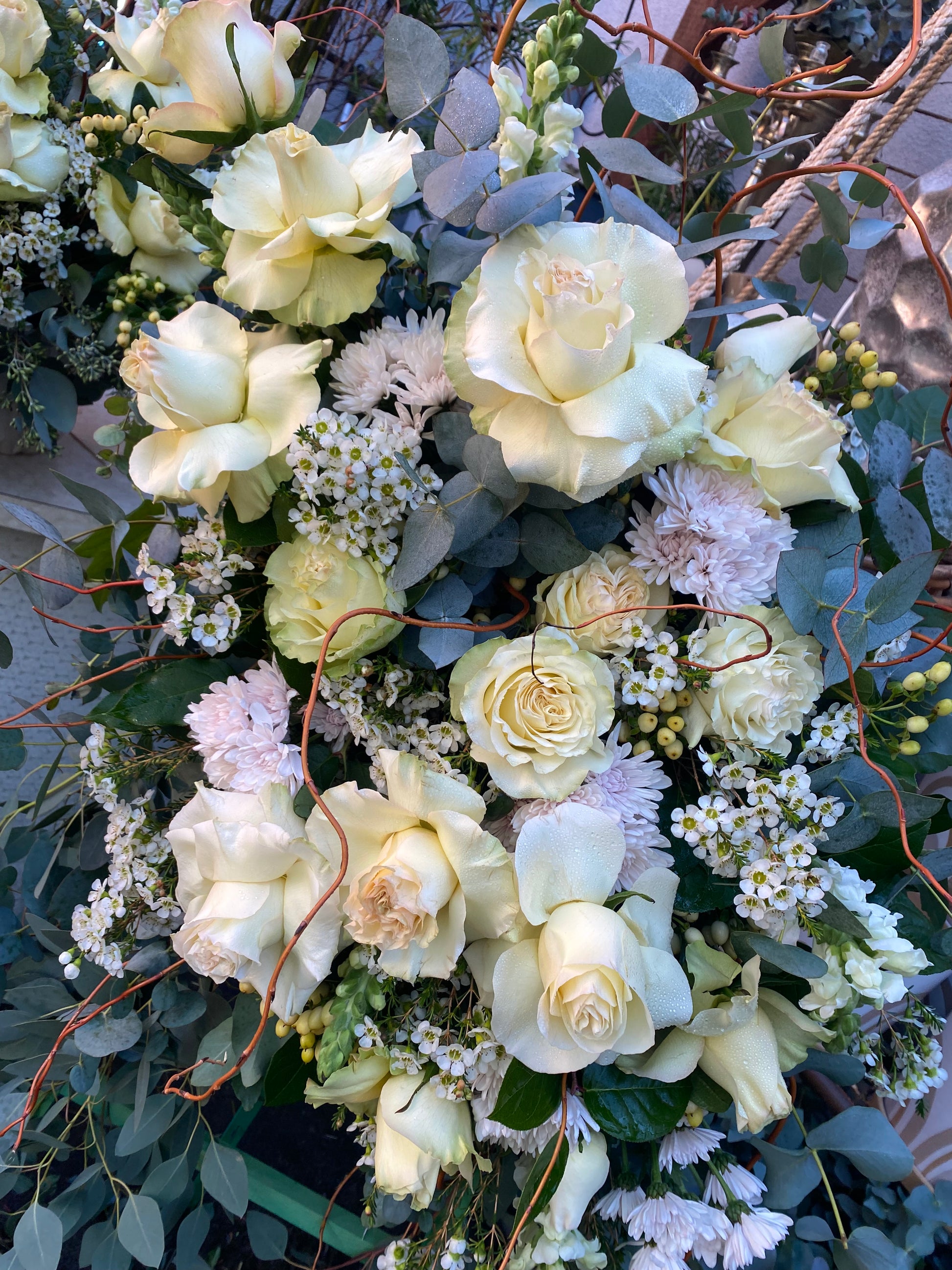 Soft-toned memorial floral arrangement designed to be placed atop the casket.